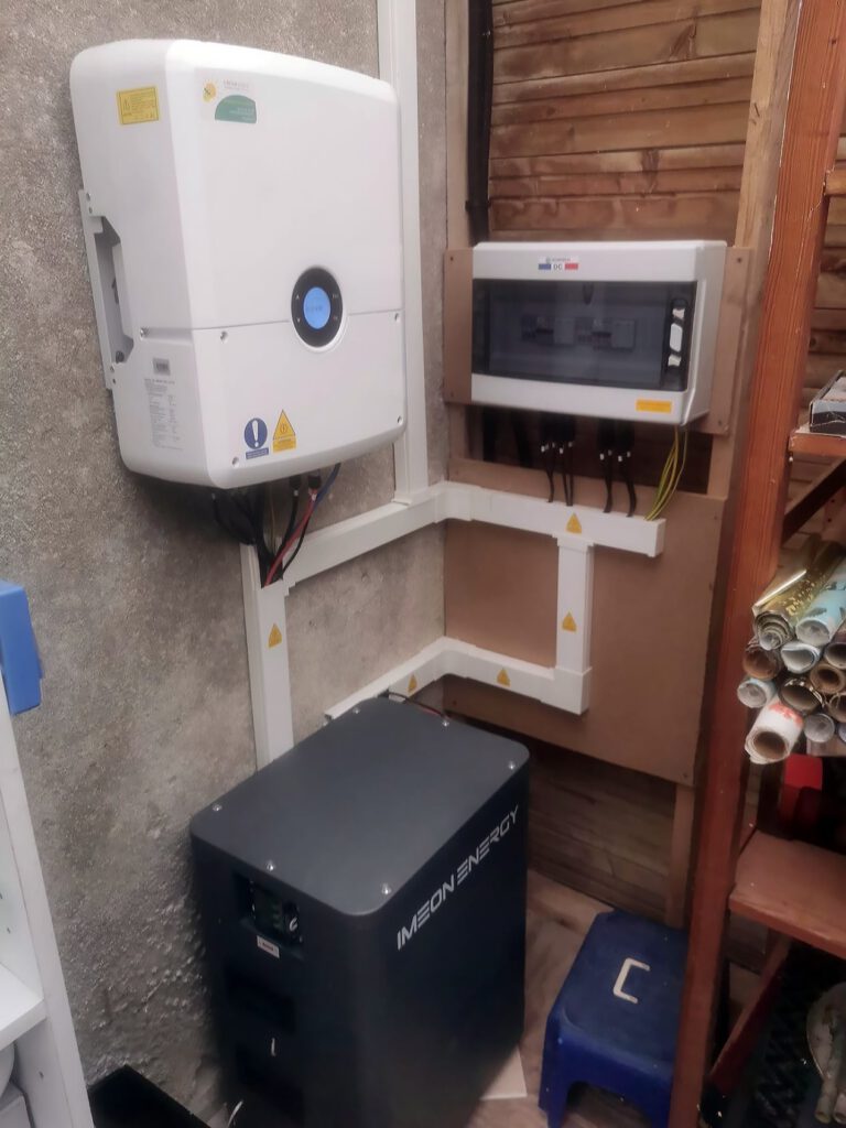 Le système est équipé d’un onduleur hybride IMEON, une solution française de référence pour la gestion intelligente de l’énergie. Il est couplé à une batterie de stockage de 7,1 kWh, permettant de consommer l’électricité solaire produite en journée, même le soir ou en cas de faible ensoleillement.